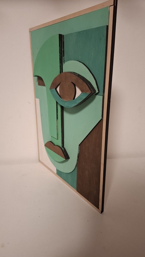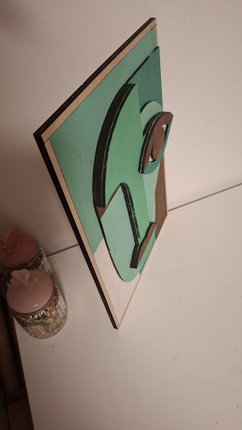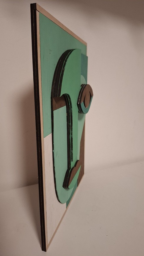 A kép 4 mm vastag rétegelt lemezből készült, precíz lézervágással kialakítva, majd kézzel festve. A kiemelkedő elemek térhatást adnak, így a dekoráció nem csak egy sík nyomat, hanem valódi, kézzel készített tárgy.