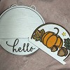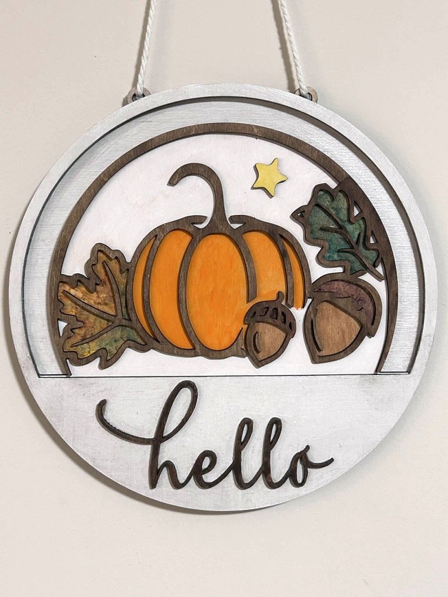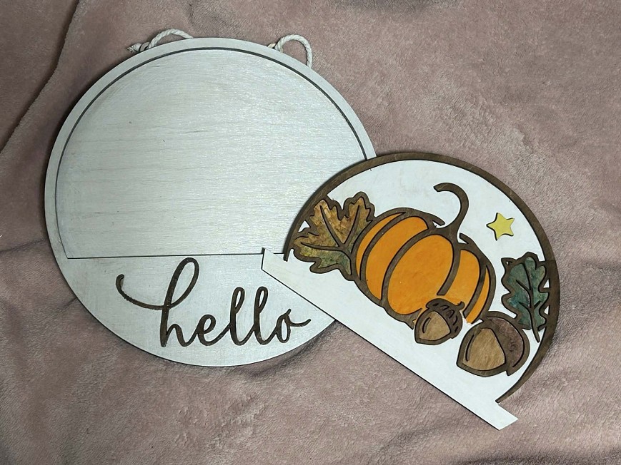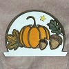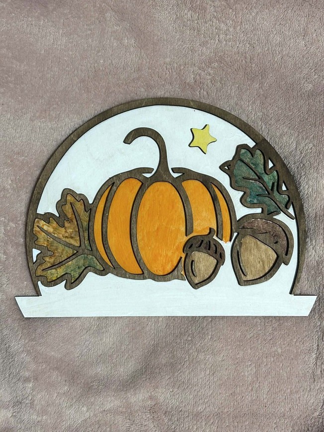 Ez a dekoráció a cserélhető betétes ajtódíszhez készült őszi betét, amely egy tökös, makkokkal és őszi levelekkel díszített mintát ábrázol. A betét segítségével könnyedén őszi hangulatúvá alakítható az ajtódísz anélkül, hogy új dekorációt kellene vásárolni.